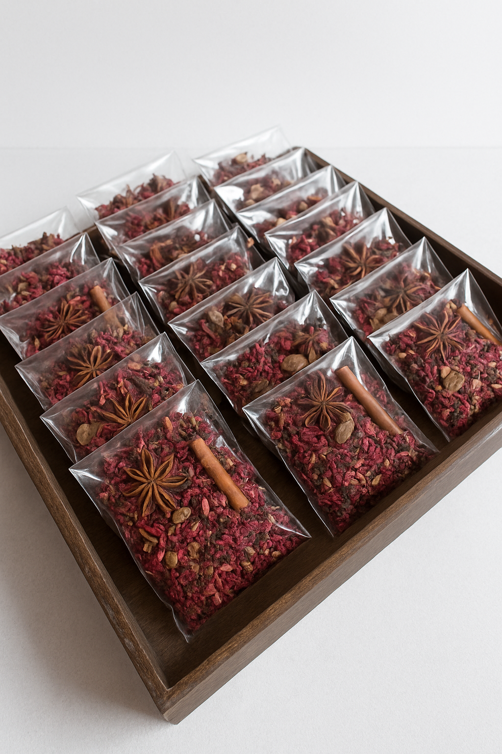 Rosenblad, hibiskus, stjärnanis, kardemumma, kanel, nejlika.